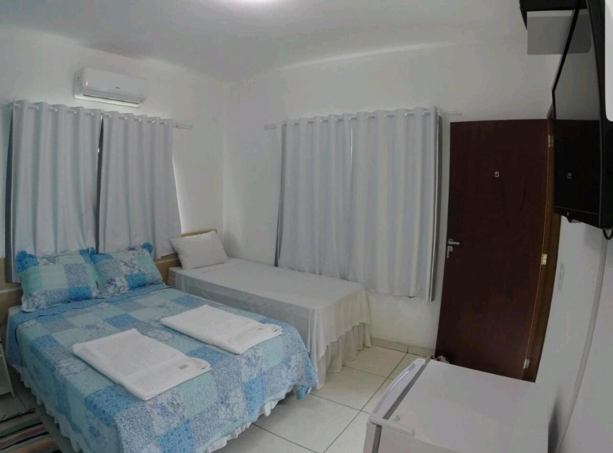A suíte está equipada com ar-condicionado, TV e Wi-Fi, frigobar, e banheiro privativo, proporcionando conforto e conveniência durante a estadia.