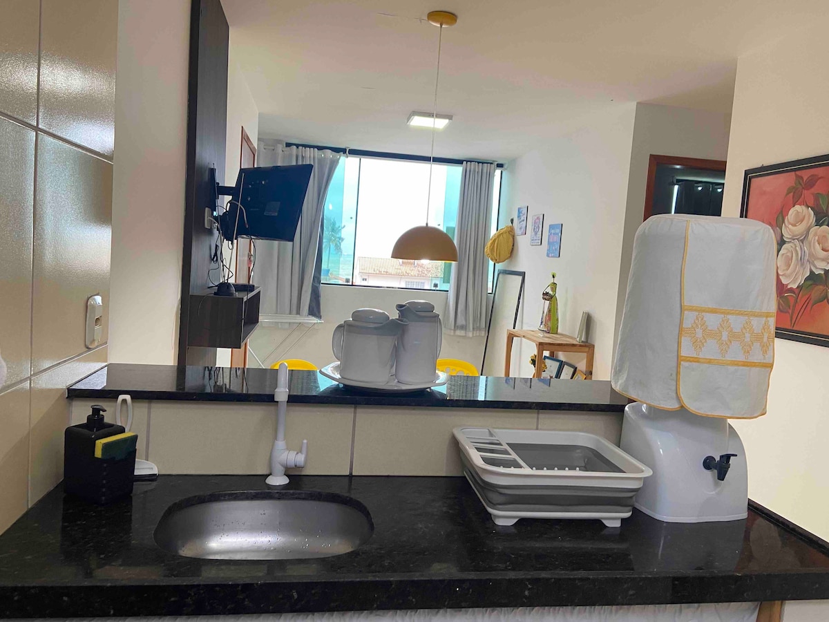 Com vista pro mar, em condomínio fechado, a 100 mts da beira mar, no segundo andar (Escada), nosso flat é simples porém preparado com muito carinho para receber nossos hóspedes, da janela da sala e da janela de um dos quarto pode-se desfrutar da vista para o mar. São dois quartos, sala de estar, sala de jantar, cozinha, banheiro e uma pequena área de serviço. bem localizado dentro da cidade, próximo a mercado, farmácia, pizzaria, padaria, e do centro da cidade, Wi-Fi gratuito,