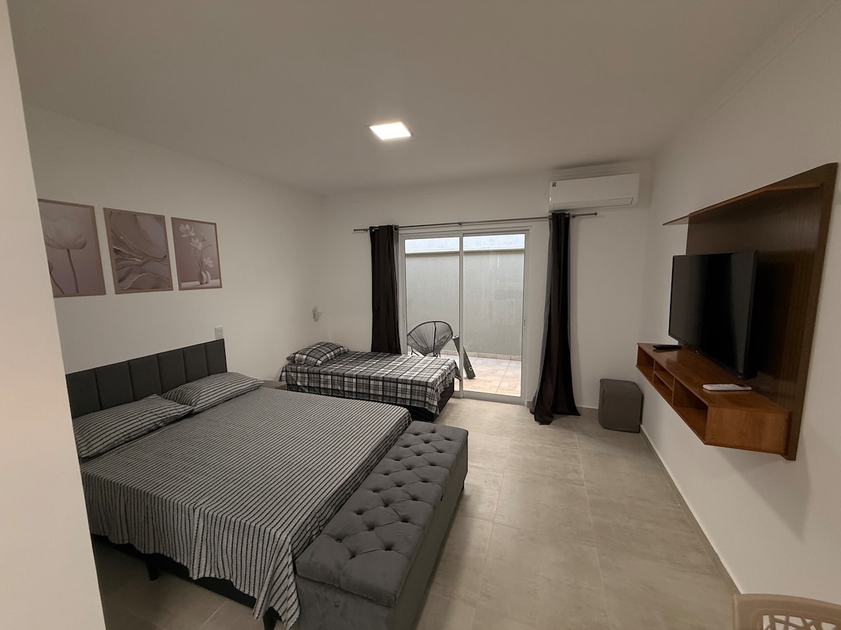 Apartamento mobiliado, com três suítes, forneço roupas de cama e banho . Quartos equipados com ar condicionado . TV com Netflix, IPTV, You tube, internet em todo local. Cozinha equipada com fogão, geladeira, microondas, liquidificador e utensílios. Garagem coberta e privada para um carro. Terraço compartilhado comigo e ou outros hóspedes da unidade ao lado.