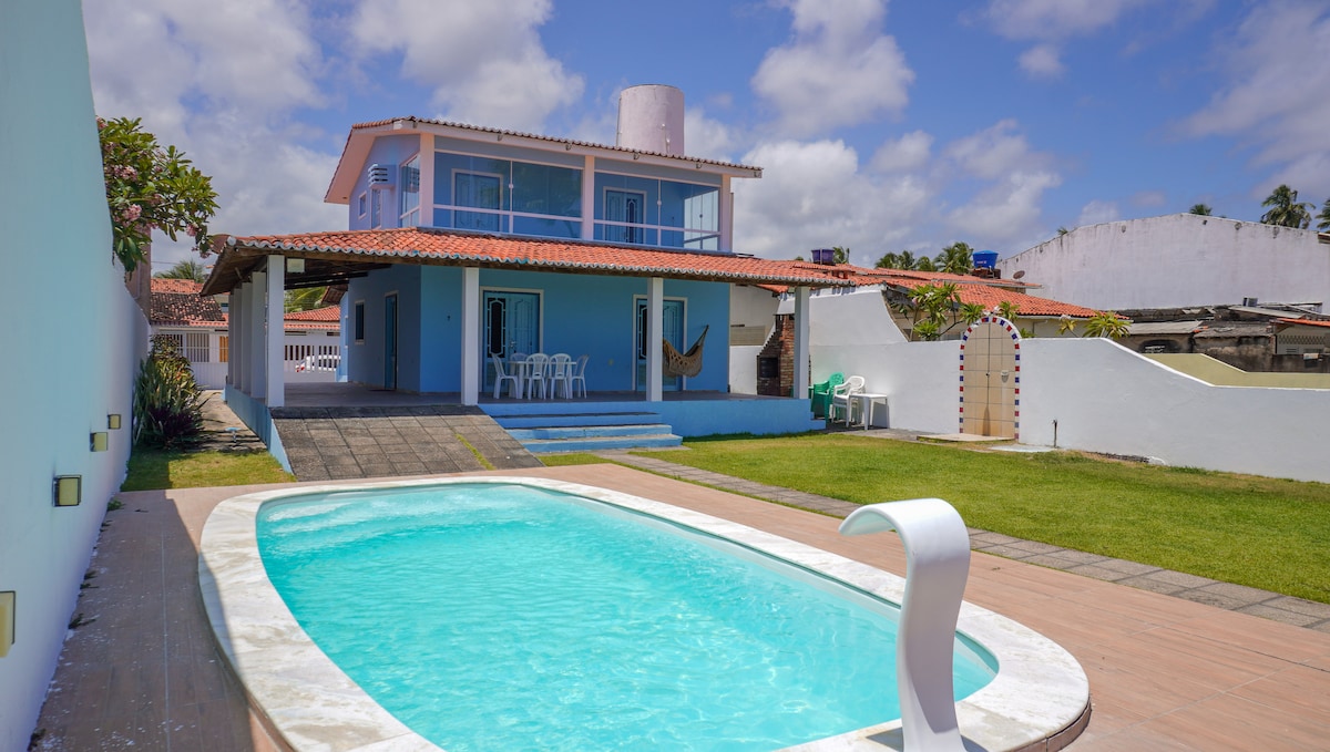 A casa não é beira-mar, mas fica a apenas 250 metros da Praia de Peroba , em Maragogi. • 3 suítes com cama de casal e ar-condicionado • Sala com sofá e TV • Cozinha completa com todos os utensílios • Piscina privativa • Próxima aos passeios para as famosas piscinas naturais de Maragogi Acomoda confortavelmente até 6 pessoas em um ambiente tranquilo e seguro, ideal para famílias ou grupos de amigos que querem aproveitar a praia e os passeios da região.