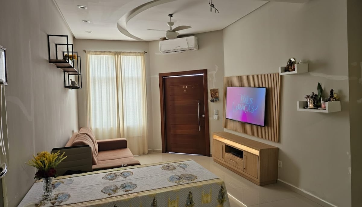 Apartamento excelente para casal com cama queen size e possibilidade de ate 4 pessoas com o sofá cama localizado na sala. Dois banheiros completos com chuveiro elétrico e ar condicionado em todos os ambientes. Garagem para um veículo. Cozinha com geladeira duplex, fogão a gás com forno e filtro duplo de água. Smart Tv de última geração 4K na sala e quarto.Internet de fibra ótica de alta velocidade, espaço para home office no andar superior(para maior conforto e produtividade). Lava e seca roupas