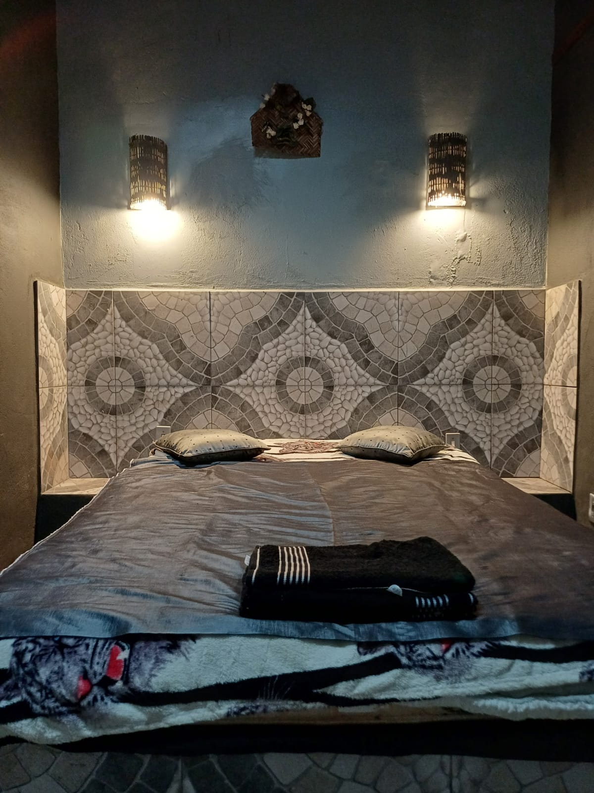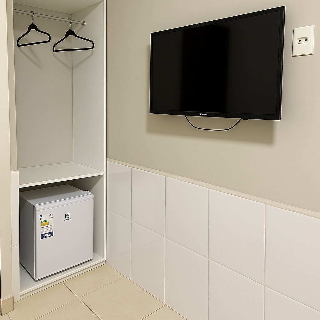 O quarto possui uma cama de casal, wifi, ar condicionado e frigobar. Conta com banheiro privativo com ducha de água quente e fria. É uma acomodação simples, mas aconchegante, com móveis de boa qualidade e tudo o que o hóspede precisa para uma estadia confortável. A recepção dispõe de uma área compartilhada para refeições, equipada com micro-ondas, máquina de snacks e bebidas e uma máquina de café, oferecendo praticidade ao hóspede.