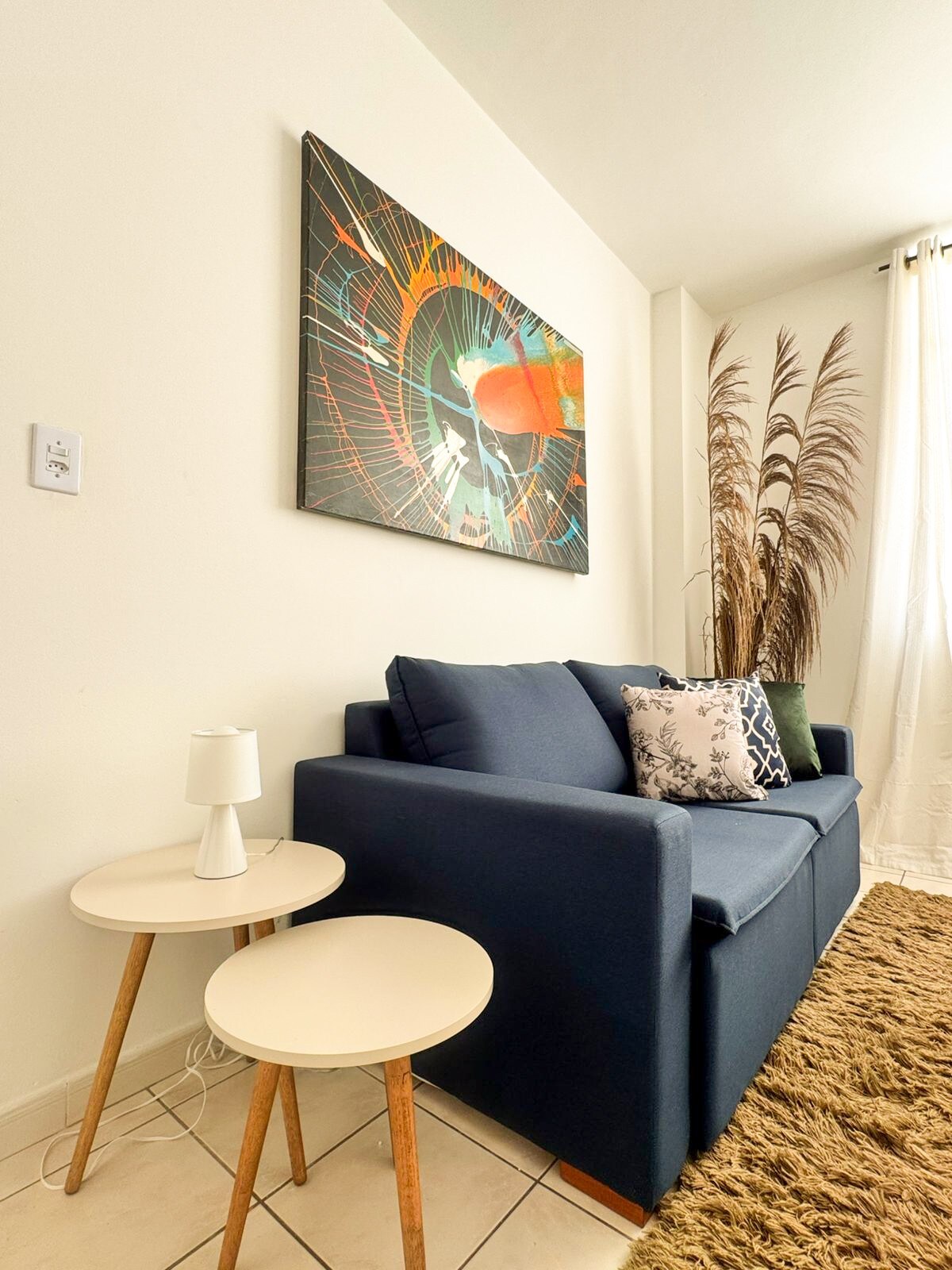 Apartamento completo e bem equipado, possui cozinha com geladeira, cooktop, forno, microondas e máquina lava e seca. Com dois quartos, sendo uma suíte. Suíte com uma cama de casal e o outro quarto com uma bicama. Banheiro social. Localização estratégica, próximo de farmácias, restaurantes e supermercados. Condomínio com área de lazer completo com piscina e academia. Estacionamento privativo com uma vaga de garagem.