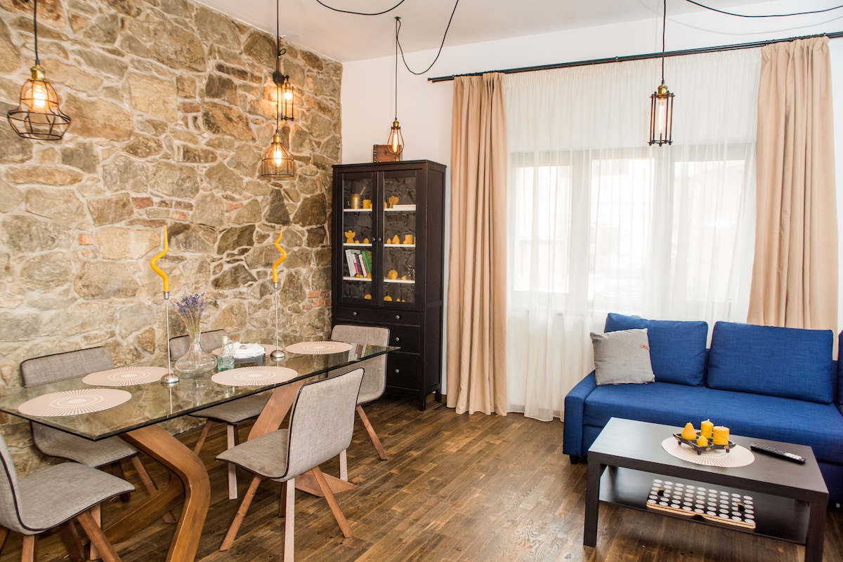 Uită de grijile tale în această locuință liniștită și spațioasă cu o panoramă superbă spre parc, confortabilă, smart tv, aer condiționat. Apartamentul este nou, situat la etajul I, zona rezidențială, la 2 km față de aeroportul Internațional Baia Mare, supermarket, restaurant în zona “Centro “. Apartamentul are o suprafață de 200 mp, 2 bucătării complet echipate + terasa exterioară de 100mp , 2 dormitoare, 4 paturi + canapea extensibila , 2 băi, 2 livinguri.