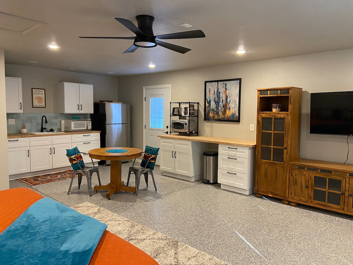 Family friendly (with ungated pool) 411sq ft Private Casita newly REMODELED! Sleeps up to 4. King feather bed & a pullout queen sleeper. Located just past a quaint garden where you can catch hummingbirds drinking. Private parking & entrance, just come and go. ASK ABOUT: Our other King Suite just feet away! Can sleep additional 2 guests! Cool off in pool, use outside patio (where cooking station is located, there's no kitchen in the casita). Min. from I-10 & stellar Tucson Biking Loop!!