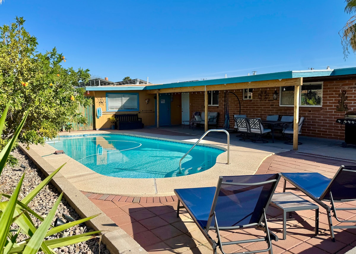 Family friendly (with ungated pool) 411sq ft studio-style space with 2 open sleeping areas. Sleeps up to 4. King feather bed & a pullout queen sleeper. Located past a quaint garden where you can catch hummingbirds. Private parking & entrance just come & go. BOOK Our Other King Suite right next to the Casita! Can sleep 2 additional guests! Cool off in pool, use outside patio (where cooking station is located, there's no kitchen in the casita). Min. from I-10 & stellar Tucson Biking Loop!!
