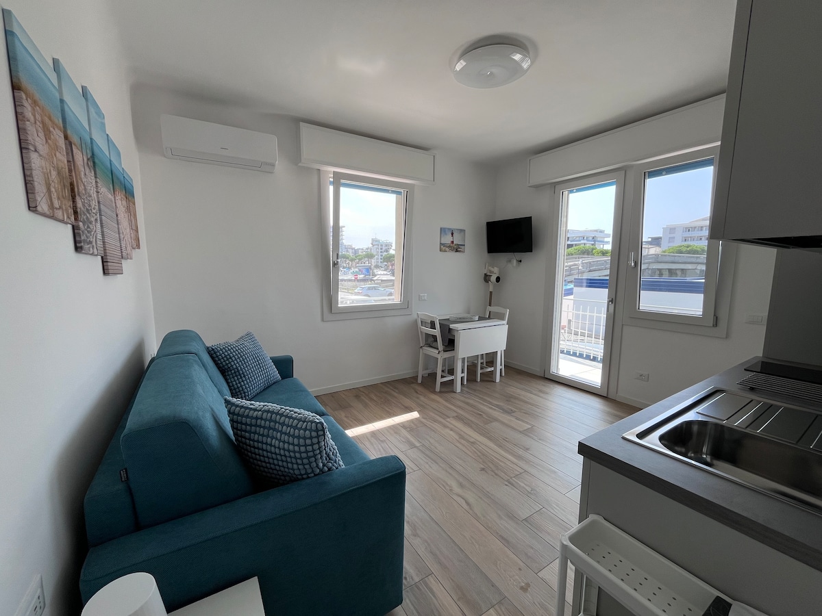 Ampio monolocale 35 mq, climatizzato, con angolo cucina, 1°piano, ascensore, piscina condominiale, accesso diretto spiaggia, a 300m da via shopping, zona tranquilla ben servita da attività commerciali varie entro 100m. Openspace terrazzato con TV led-sat DE/Chromecast, zona notte con letto matrimoniale e divanoletto 2 piazze, attrezzato con lavastoviglie, lavatrice, micronde+grill, macchina espresso DolceGusto e bollitore Bagno con box doccia, phon Posto auto riservato in garage - no furgoni
