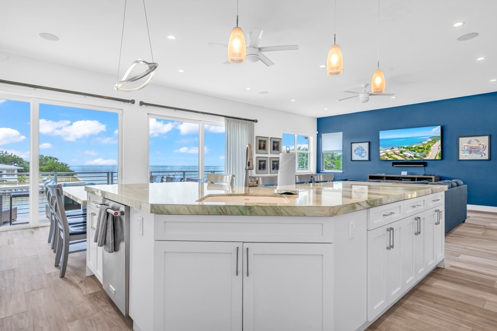Welcome to Hook, Wine & Sinker, a beautifully designed 3-bedroom, 2-bathroom ground-level waterfront, pet-friendly home where comfort meets convenience in the heart of the Florida Keys. Overlooking the peaceful waters of Boot Key Harbor, this spacious getaway is perfect for families or small groups, with a maximum occupancy of 8 guests. Sleeping arrangements include 2 king bedrooms and 1 bedroom with 2 twin beds — there is no pullout couch.
