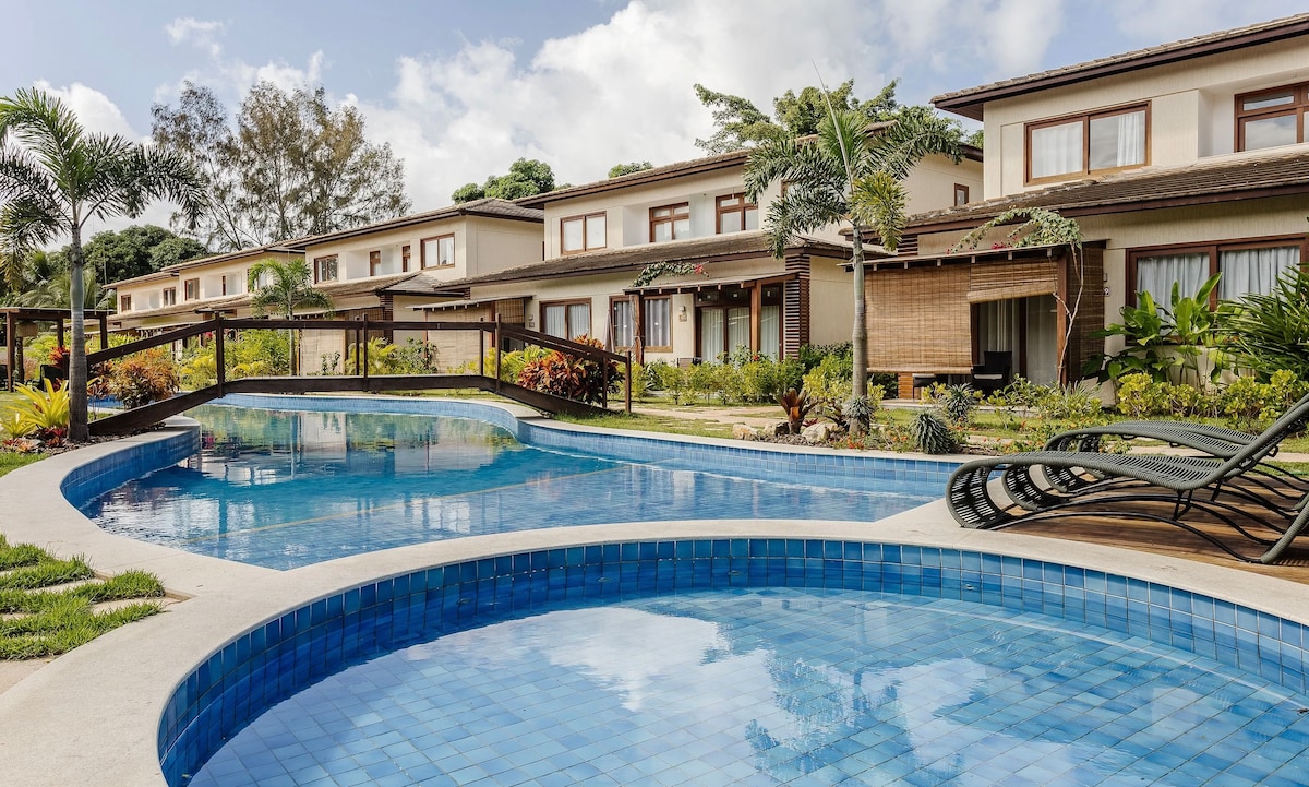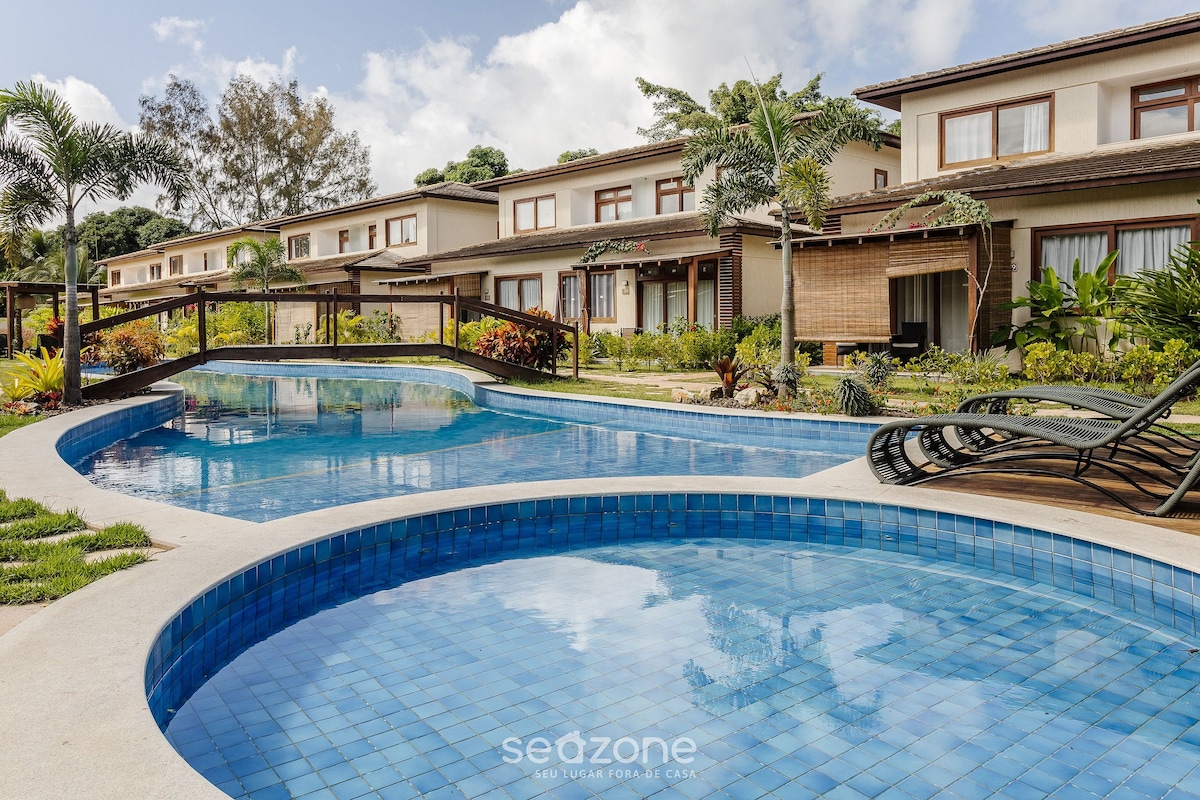 Ocean Bliss Retreat is the ultimate beachfront retreat on Cassange Beach. Located in a 30,000 m² green condo, it features 3 pools, a gym, tennis courts, beach tennis, and a seaside bar and restaurant. The house includes 2 inviting suites, a living room, and a veranda with stunning ocean views. A fully equipped kitchen with an ice machine and beer fridge ensures a comfortable and luxurious stay.
