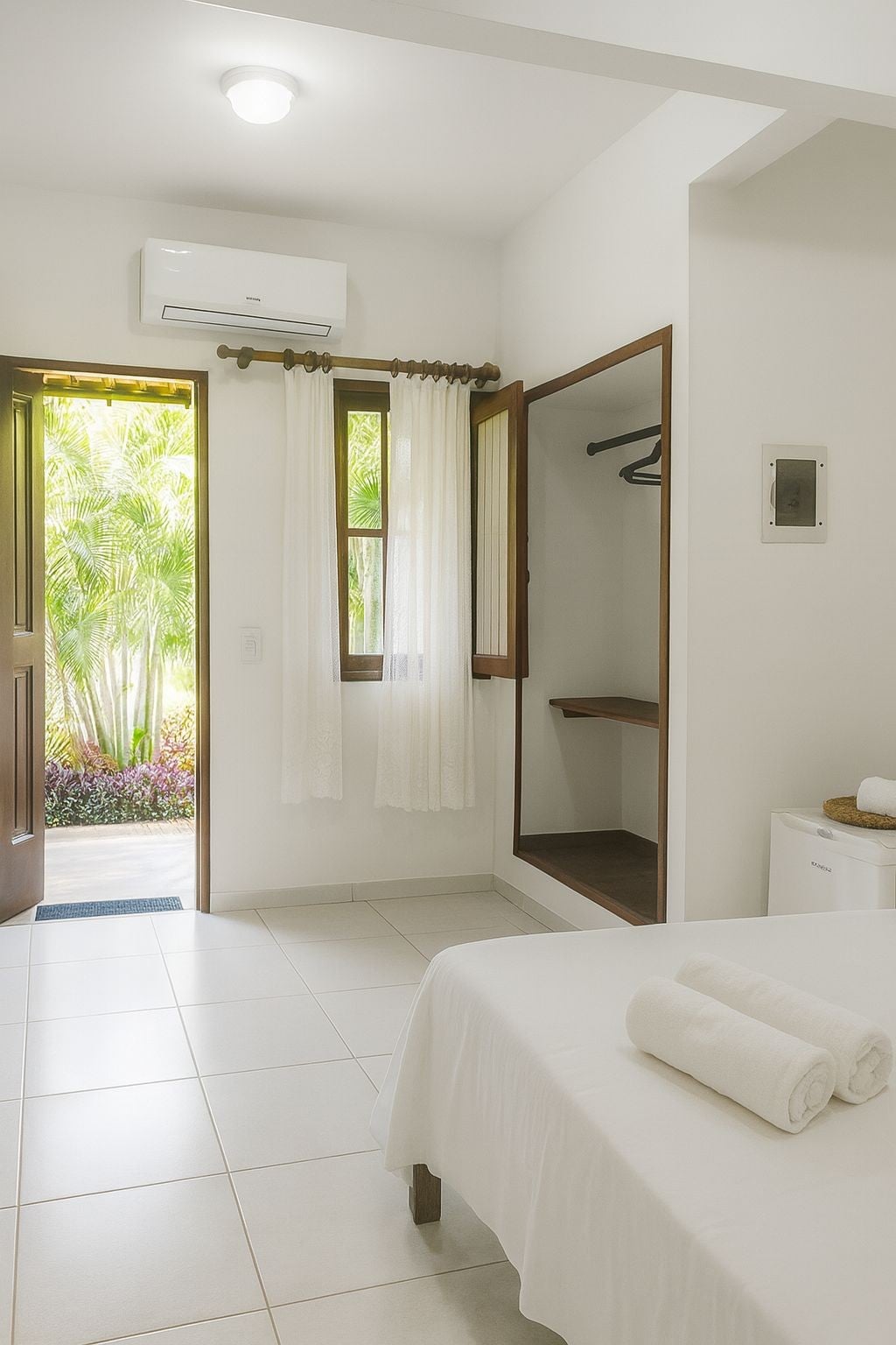 Relaxe neste espaço calmo e cheio de estilo. Uma suíte aconchegante, privada para Casal, com ar condicionado, frigobar, roupas de cama e banho e ainda com uma cozinha em área comum e aberta com muito verde ao lado da piscina. Espaço amplo com estacionamento, a 5 minutos caminhando da praia Ponta do Muta. Aqui você relaxa com o barulho do Mar e dos pássaros. Ideal para descansar e também para curtir as lindas praias das proximidades e explorar os passeios com toda orientação dos anfitriões.