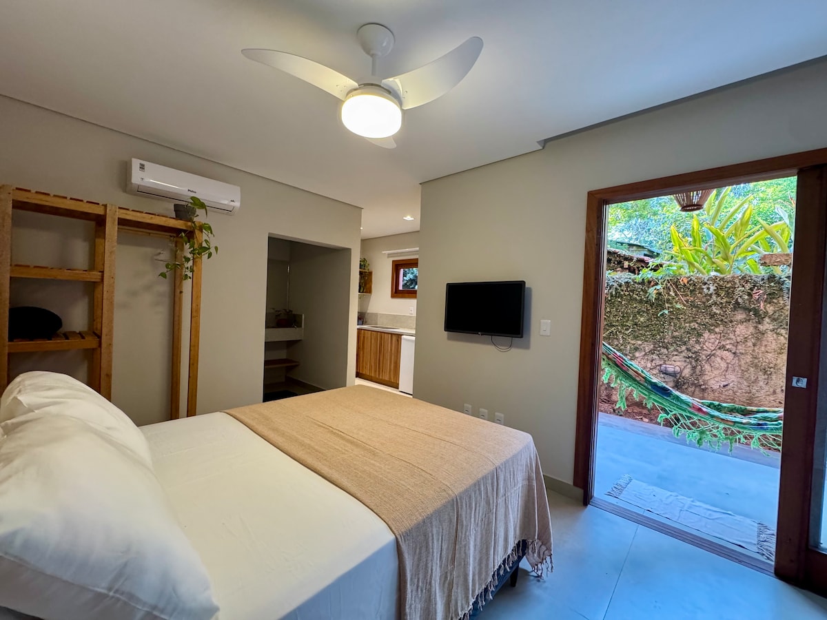 Bangalô Hari Om A experiência de viver no paraíso! Bangalô inteiro com quarto, banheiro, sala e cozinha integrada. Varanda com rede e vista para a mata verde preservada. Ficamos a 700 mts, 5 minutos de carro e 10 minutos a pé da praia de Taipú de fora bem próximo às piscinas naturais.Lugar em meio a natureza para vivenciar momentos de paz, tranquilidade e boas energias!! Aqui seu pet também é super bem vindo!! A vegetação do jardim sofrem pequenas alterações no decorrer das estações.