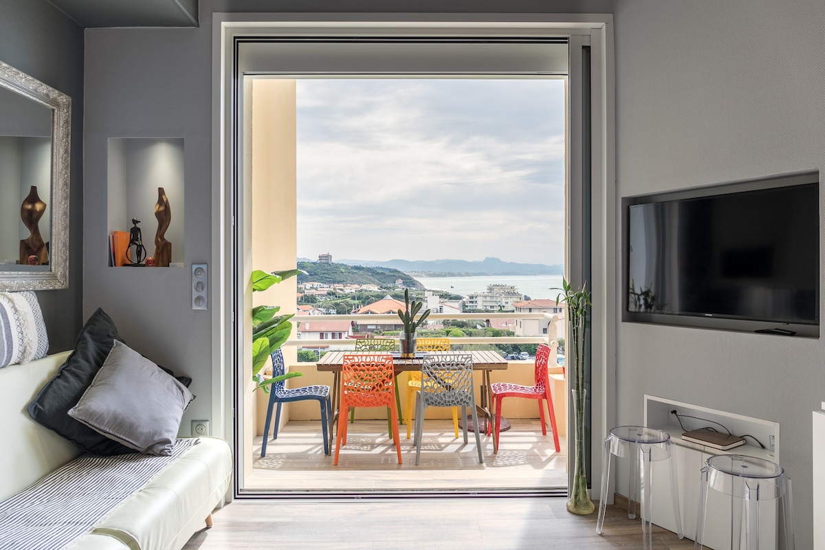 Mon studio vous séduira par sa situation, sa vue mer imprenable sur l'Espagne et la côte basque. Accès direct à la plage mythique des Basques, tout Biarritz à pied, à proximité des halles animées, des restaurants, du centre ville riche culturellement. Vous l'apprécierez pour sa luminosité, sa déco et ses équipements entièrement neufs. Piste cyclable au pied de l’immeuble.Local vélo mis à dispo. En option place de parking privé. Le studio vient d’être classé trois étoiles par l’I.C.H.⭐️⭐️⭐️