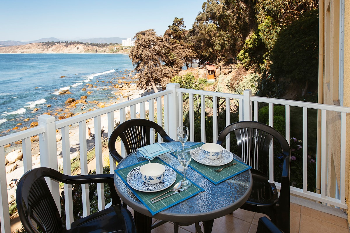 Hermoso departamento recién remodelado para ofrecer una experiencia inolvidable, en primera línea frente al mar cautiva todos tus sentidos. Preparado para estadías placenteras, cocina, coffee corner, escritorio-comedor, terraza, parrilla eléctrica, TV y Wifi. Caminado por bosques bajas a hermosa playa privada o a las piscinas, sauna, jacuzzi, canchas deportivas del condominio. Horcón tiene para comprar todo lo que necesites o a almorzar en los restaurantes. También puedes recorrer la costa.