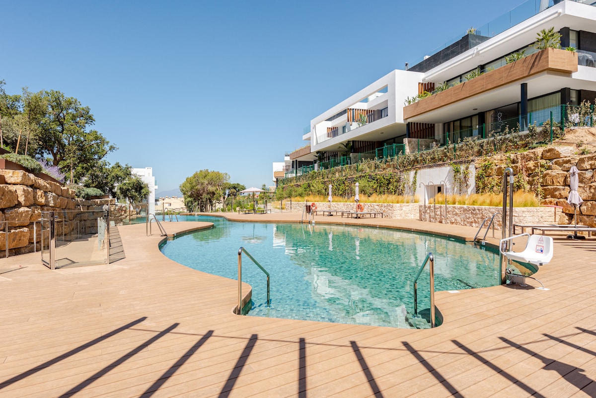 Moderno apartamento de diseño completamente nuevo, situado en una urbanización llamada Jardín Botánico, en plena naturaleza y a tan sólo 15 minutos en coche de Puerto Banús. La urbanización se encuentra rodeada de naturaleza y un rio cerca, pero con todas las comodidades de de la ciudad y la playa a sólo 10 minutos en coche. También disponemos de 3 piscinas exteriores y 1 piscina interior climatizada (abiertas según temporada) jacuzzi, sauna, pista squash, tenis, padel, gimnasio. Ideal para 4.