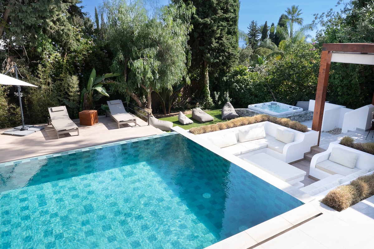 Contemporary 4-bedroomed luxury villa with new outdoor jacuzzi and chill-out area, tropical gardens, private pool & swim-up bar. Large BBQ area with seating, own gym & sauna, fully fitted with everything you need for a luxury stay. (POOL HEATING AVAILABLE ON REQUEST). Located in exclusive El Rosario, Marbella. The villa has private parking for 3 cars, it is a 5 minute walk to a selection of bars, restaurants & a supermarket. The beach is only a short walk, or a few minutes drive.