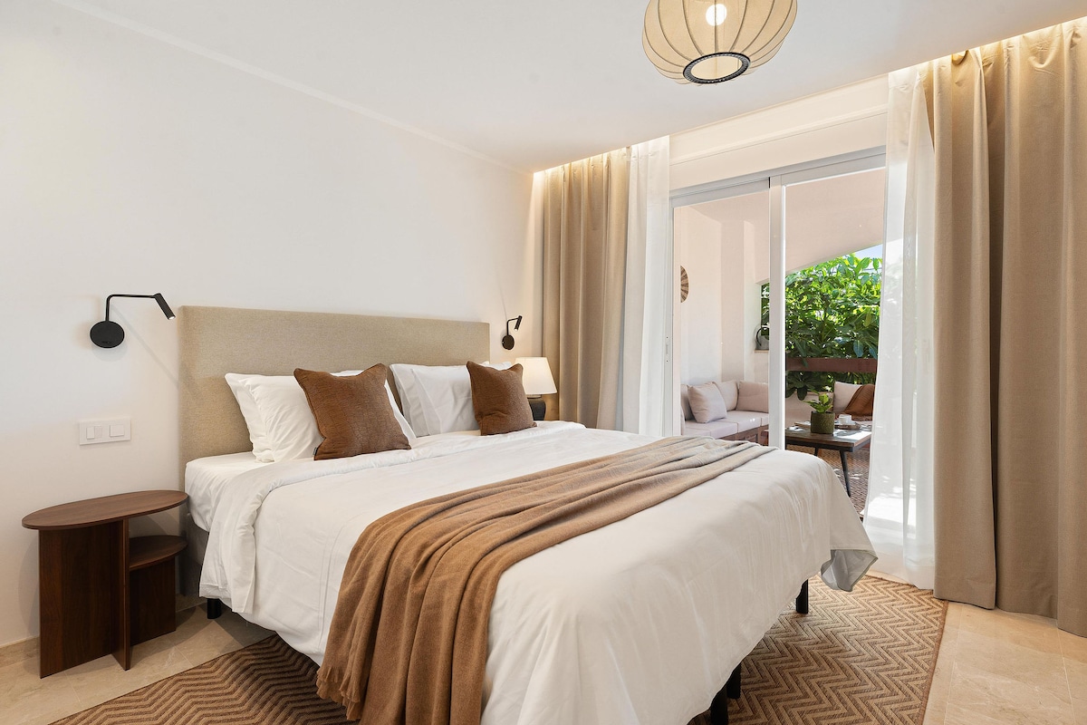 Moderno apartamento de diseño completamente nuevo, situado en una urbanización llamada Jardín Botánico, en plena naturaleza y a tan sólo 15 minutos en coche de Puerto Banús. La urbanización se encuentra rodeada de naturaleza y un rio cerca, pero con todas las comodidades de de la ciudad y la playa a sólo 10 minutos en coche. También disponemos de 3 piscinas exteriores y 1 piscina interior climatizada (abiertas según temporada) jacuzzi, sauna, pista squash, tenis, padel, gimnasio. Ideal para 4.