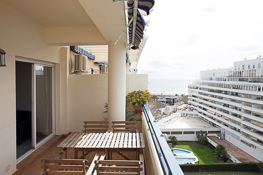 Cozy, bright, entirely renovated quality flat on the front line with sea views from the sunny and large balcony, both rooms and the bathroom. Features his and her shower, full kitchen, 2 tennis courts, 2 swimming pools (1 for children) large gardens, private beach area, free beach beds and private parking. We have a sandy beach with Blue Flag status and direct access to the sea boardwalk. Near Marbella and La Cala with 75+ restaurants and many shops walking distance. Strict cleaning in effect.