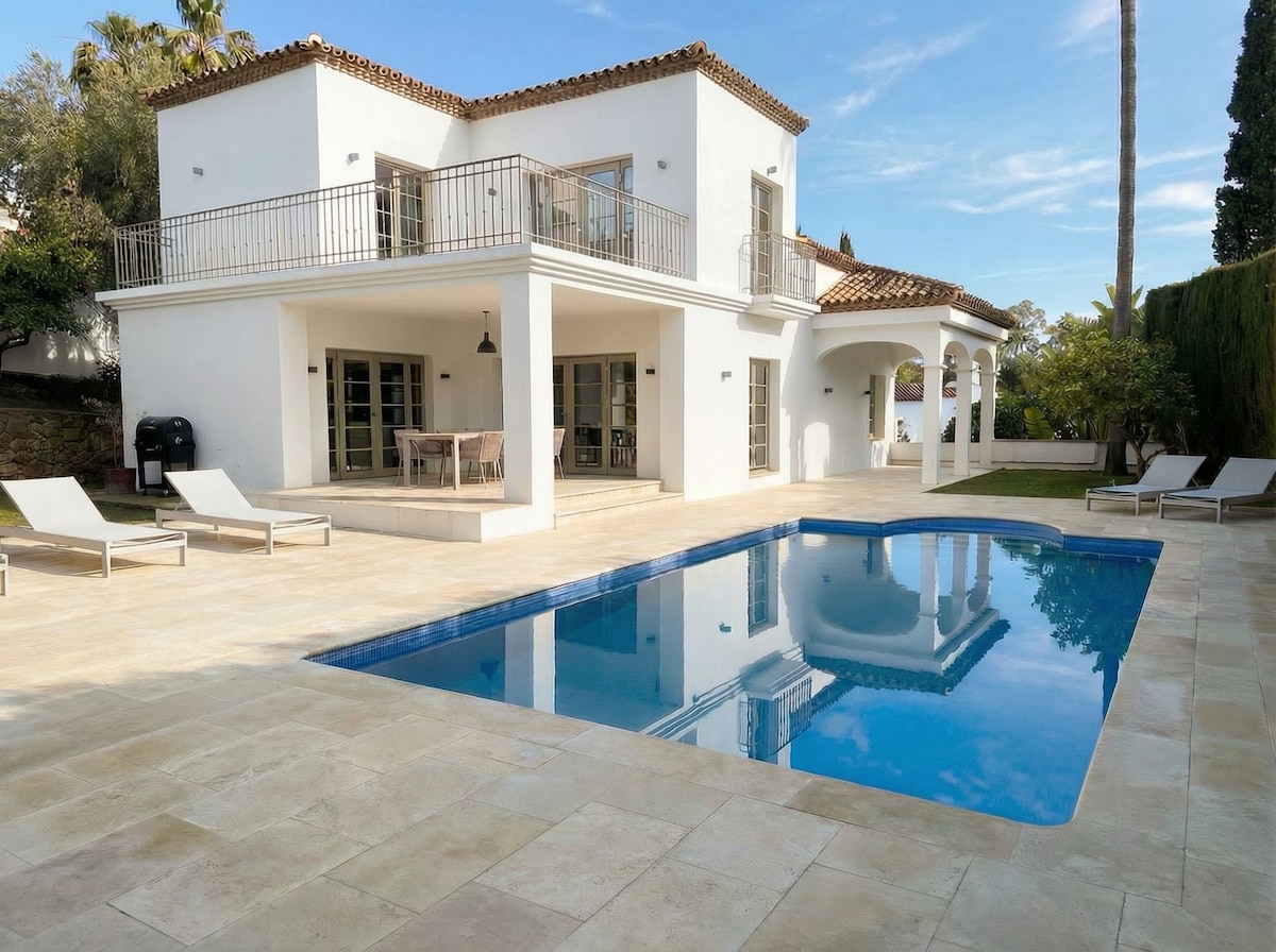 Beautiful villa in the best location in Marbella: 4 minutes driving or 20 minutes walking to Puerto Banus and its beautiful beach, 100 meters from the big supermarket Mercadona and many restaurants and pubs, and next to a bus stop. Private and quiet, it has a garden and swimming pool with a nice view of the surrounding mountains. Decorated with taste and with all the amenities you need, it is perfect for families or a group of friends. The sofa-bed allows for a 9th person to sleep if necessary.