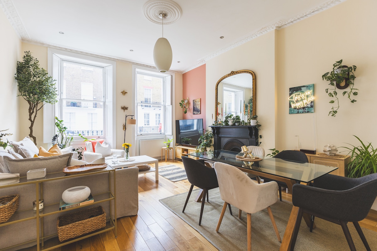 Nestled in the vibrant and chic neighborhood of Marylebone, this stunning Georgian flat offers an unrivaled base for exploring London. Perfectly blending modern British elegance with timeless charm, this is your opportunity to stay in one of the city’s most coveted locations. A beautifully curated space adorned with designer Timothy Oulton furniture and striking contemporary art. The flat exudes sophistication, with thoughtfully designed living areas that balance comfort and style.