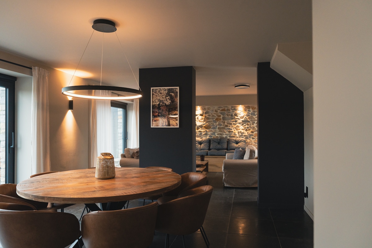 Our 250sqm family house located on the top of the Ourthe Valley has been carefully designed in the true New England spirit with a master open fire place offering you warmth, cosy and romantic moments for a memorable stay. The house is facing 100% South and benefits 360° open views, guests will enjoy stunning scenery with very long sunny days while children will love the great yard & its playground.