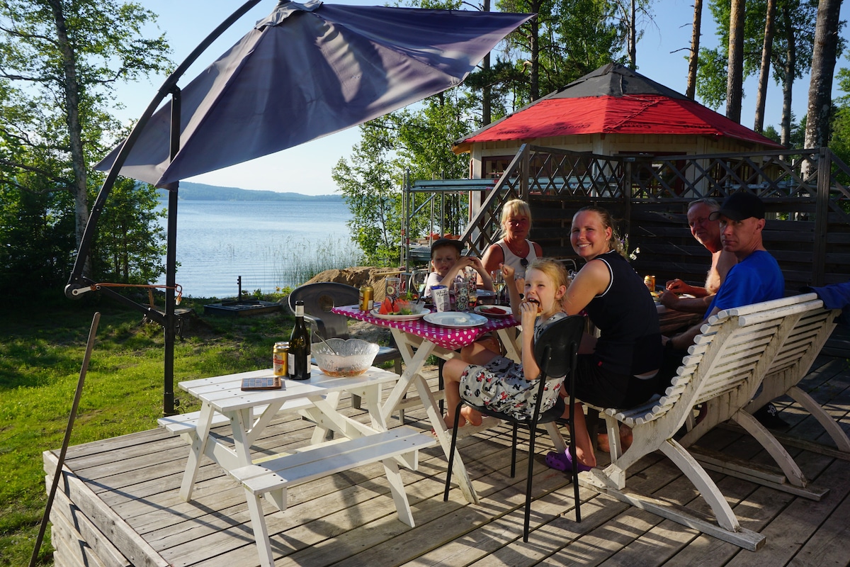Relax with the whole family at this peaceful lakeside retreat. Enjoy a secluded stay with very few neighbors that are out of sight. The cabin sits 10 meters from the lake shore with a private dock. The lake is large and there is a row boat for guest usage. The cabin has one full bedroom and one spacious sleeping loft with two beds and additional storage space. It also has one bathroom and a fully equipped kitchen. The living room has a fireplace and access to a porch with a fantastic view.