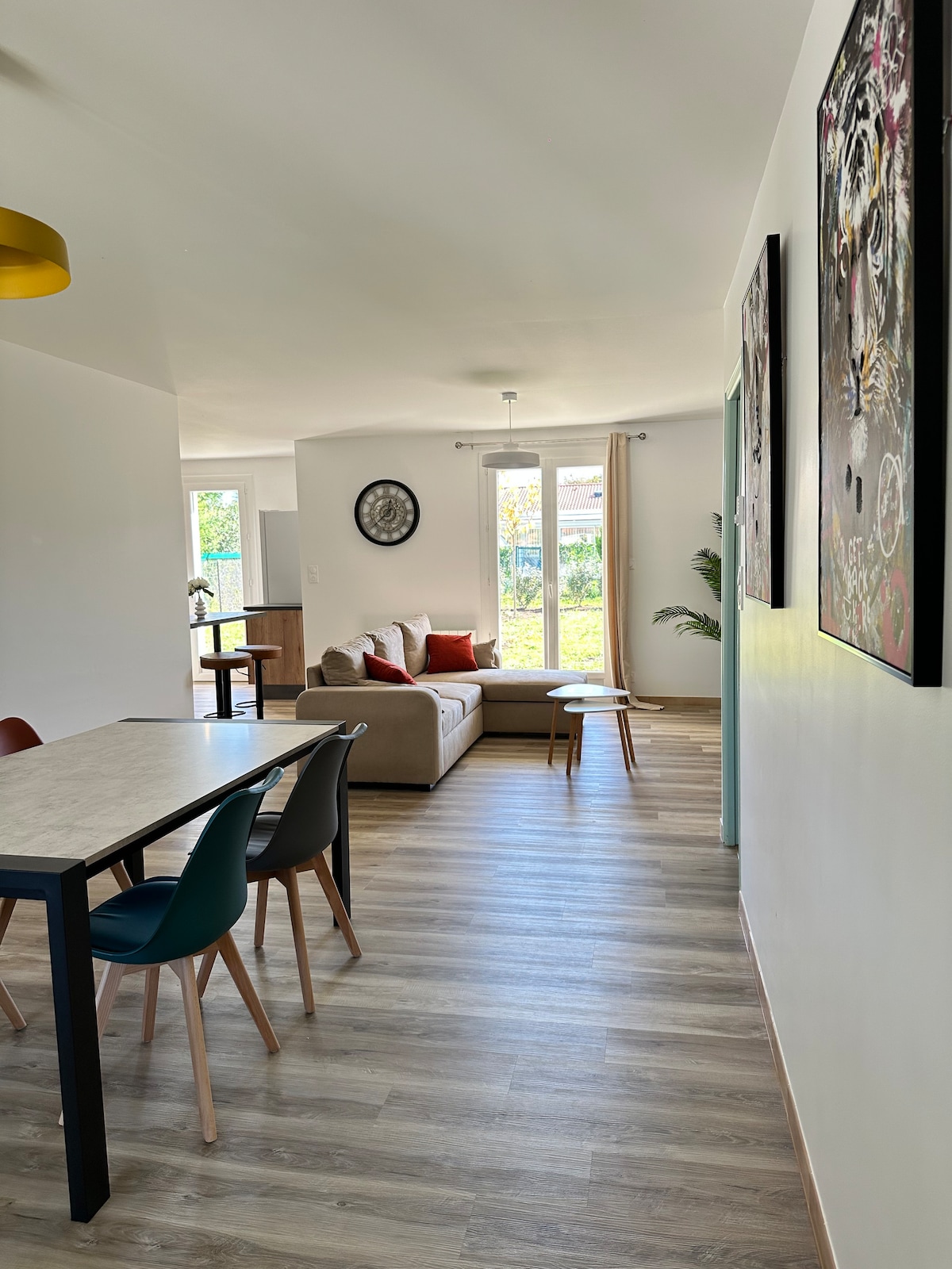 Le centre-ville est accessible à pied(5 min). Marennes plage et sa retenue d'eau, idéale pour de jeunes enfants est à 2.5kms Au centre de Marennes, une maison neuve, de plain pied de 75 m² avec garage de 26m2, terrasse et jardin clos. 2 chambres : idéal pour 4 personnes. Nos amis les animaux ne sont pas acceptés et la maison (garage y compris) est non fumeur. Grande pièce à vivre (40m2) comprenant une cuisine équipée (baie galandage donnant sur terrasse), coin repas et salon.