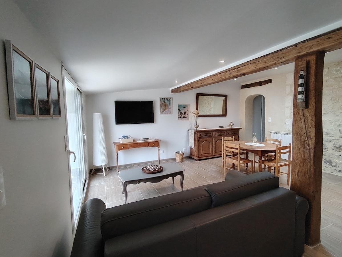 Studio moderne et lumineux de 35m² dans une grange rénovée, à 5 min à pied du centre de Marennes. Couchages en mezzanine + canapé-lit, cuisine équipée, salle de bain avec machine à laver, clim réversible, Wi-Fi, TV. Calme, en retrait de la route. À 10 min de la plage en vélo. Idéal pour un séjour détente entre mer et nature. Il se situe à 15 minutes de l’île d’Oleron, 45 minutes de La Rochelle et 1h30 de Bordeaux.