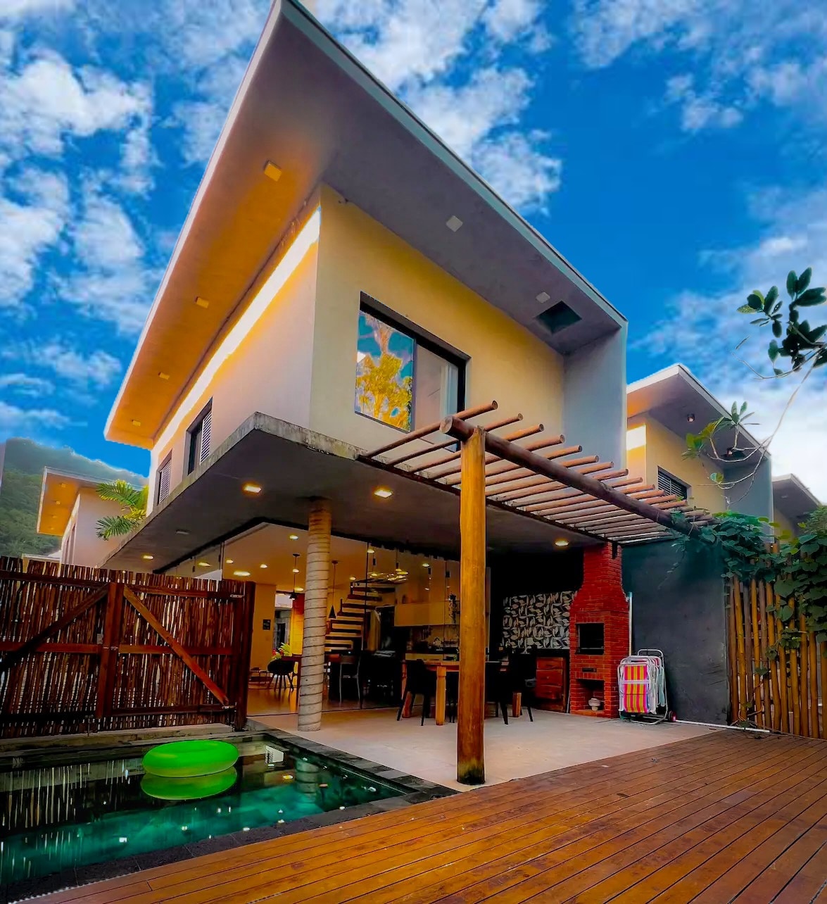 * Casa de 200m2 moderna e clean, pet friendly(100% cercada), c/academia, 4 suites, ar cond, 2 TVs(sala/suite) em area nobre de maresias, tendo a peh mercado, farmacia, padaria e restaurantes. * Piscina e churrasqueira privativas, num condominio pe na areia c/7 casas e seguranca/portaria 24hs. * A casa possue roupa de cama completa/toalhas, filtro de agua, airfry, wifi, cafeteira, 110V, maq de lavar, utensilhos de cozinha/churrasco, guarda sol, cadeiras de praia e 2 vagas de garagem.