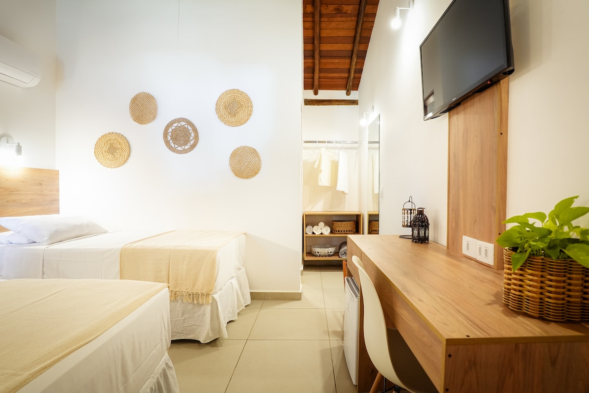 Nosso Quarto Duplo Standard no Térreo é equipado com TV, frigobar, ventilador de teto e ar condicionado para o seu conforto. Este quarto acomoda 02 pessoas.