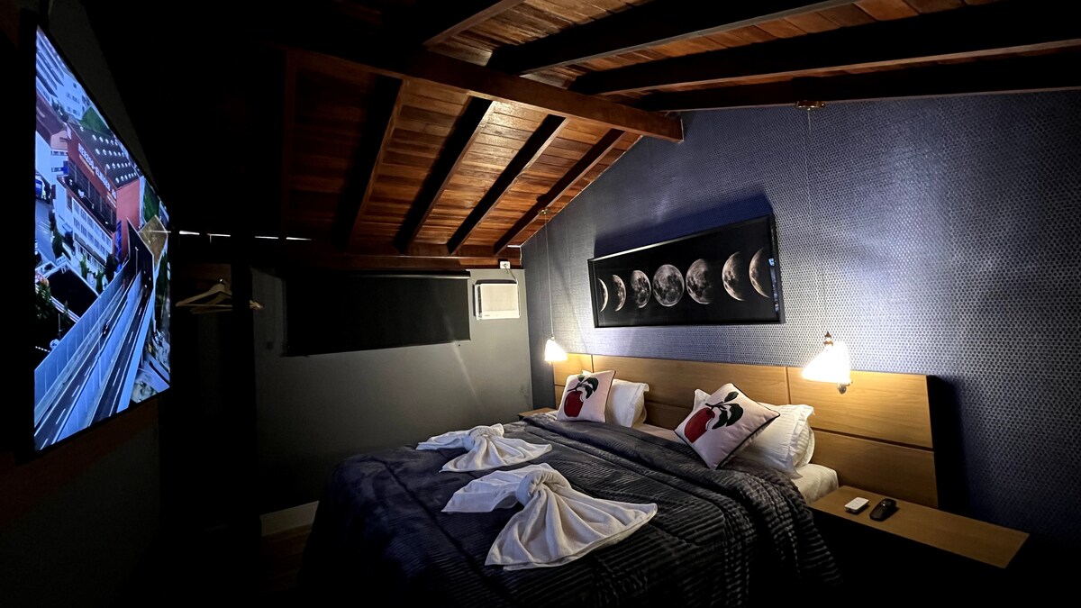 Style and Comfort! Breakfast included. Measuring 38m² and located on the upper floor, the Premium Room offers sophistication and comfort. Equipped with a Queen Size bed, Smart TV and Air Conditioning, pole dance, soaking tub, gas-heated shower, hairdryer, minibar, microwave, closet or coat racks, bathrobes and private bathroom. The Premium Room offers high-quality services, such as Alexa, daily cleaning and breakfast served on individual trays. Accommodates up to 2 people.