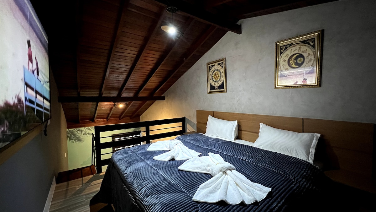 ✨ Suíte La Serena – Exclusiva, Elegante e Aconchegante! Com decoração temática inspirada no nosso hotel, essa suíte duplex é única e pensada para proporcionar uma experiência especial. Acomoda até 4 pessoas com muito conforto. 🛏️ Estrutura da suíte: Cama King Size Bicama de solteiro TV 43” TV 75” Ar-condicionado Frigobar Ideal para quem busca conforto, charme e uma estadia inesquecível no Hotel La Serena.