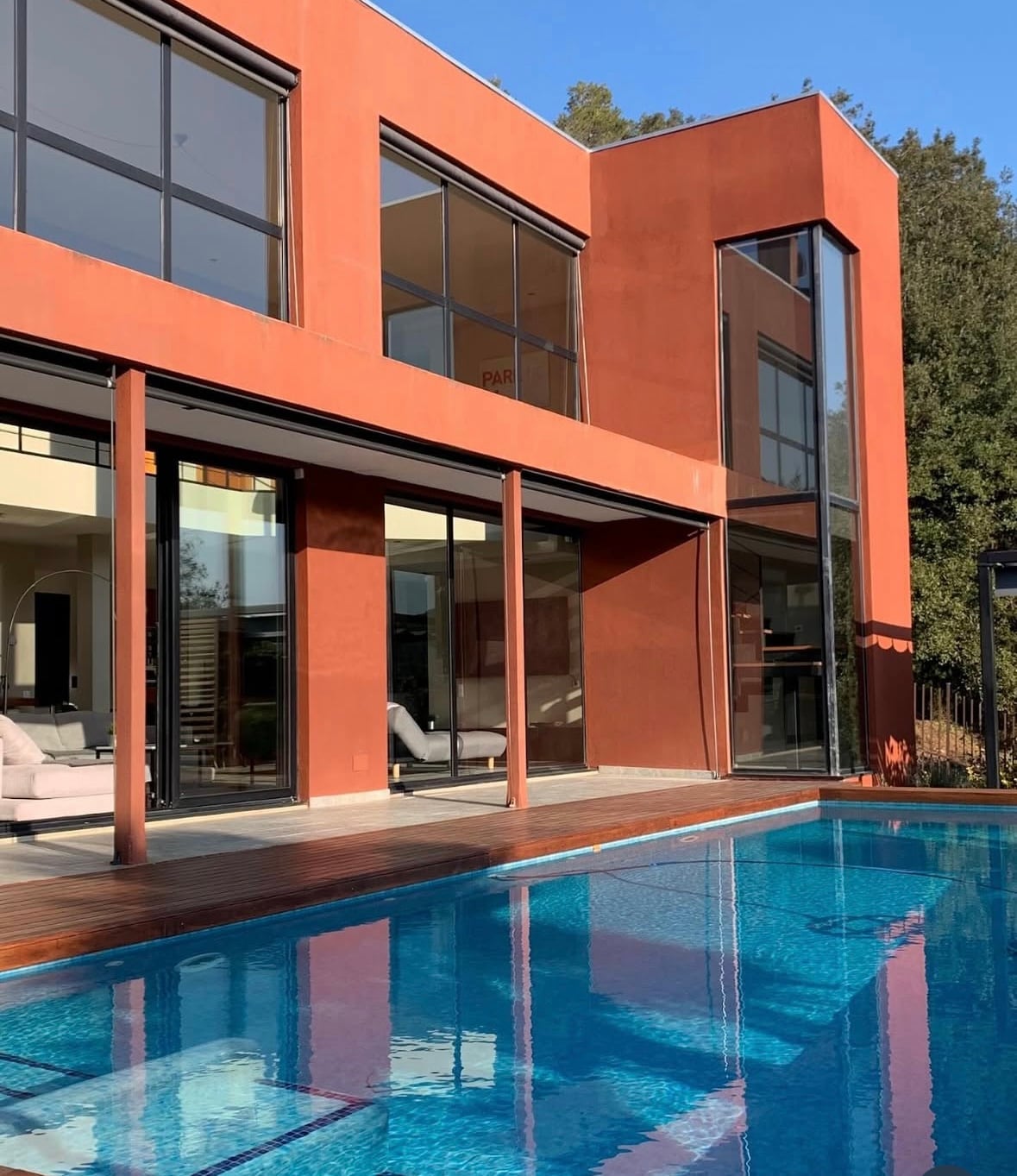 The blue color represents freedom, loyalty, harmony, truth, seriousness, purity, respect and wisdom. It is associated with physical energy, sports, the sun, the sea, modernism and technological development. It is associated with qualities such as trust, friendship, sympathy and fidelity. For this reason, blue is our color and the essence of our name. Swing in a hammock with views of nothing but deep blue sky and the Mediterranean. Take a dip in a glassy pool, exercise in an outdoor gym, and refresh under twin showers. Relax in a living room with double-height windows where moonlight comes in. The house is in a famous suburb with private security guards, 10min away from Barcelona, known for being the residence of famous FC Barcelona players. The house itself is 400sq m, and 1,200 garden. It is all made of glass, with stunning and relaxing views to the Mediterranean, as well as the city of Barcelona. Plus, it is just a few metres away from the natural forest of La Marina. The house has two floors and a mezzanine. The groundfloor has a huge projection and party room, with a bar and couches. There is also a 25sqm bath room carved in natural stone and a gym and parking place for 3-4 cars. The upper floor has four rooms, including a 45sqm suite with complete bathroom integrated to the room, with shower and a dresser, with direct views from the bed to the sea. The other bedroom is a quiet one, with views to the rear garden. It has a separate bathroom with natural daylight ceiling for own use. The other rooms are a dresser and on office. The living room is 60sqm and has a double-height space and is all made of glass. The kitchen is massive, with central isle and access to the rear garden. The mezzanine has a couch and a table, the perfect place for a "siesta" or just relax a bit. It gains access to a private roof terrace, with views to the front and rear gardens. The house has two gardens. The front one is a "tropical" one (palm trees, deck chairs and grass). It also has a wide porch, next to the windows, in case took enough sun! The rear garden, with a BBQ, is a "Mediterranean" one, with trees and bushes from the region. There is also a lake-decorated side garden, with a fountain and stones. We offer accommodation and use of all facilities: house, parking, gym, pool and garden. We provide service during the stay, pool cleaning and share the fruits collected from fruit trees and farm eggs. We maintain a cordial relationship with guests while respecting, above all, privacy. We totally left the house for total guest comfort. We maintain a contact phone 24 hours to unforeseen circumstances. The house is in an upscale neighborhood in Badalona, an area northeast of Central Barcelona. The house is near a protected park, so there is close and respectful contact with nature. The residential complex has easy commuting links to Barcelona. There are bus connection to the center of the urbanization (about 500 meters from the house). However we Sn recommend using vehicle since there is steeply sloping terrain. Vehicle communication is quick and easy. Guests staying emphasize comfort garden, house design, tranquility and sea views.
