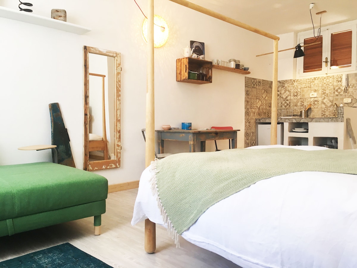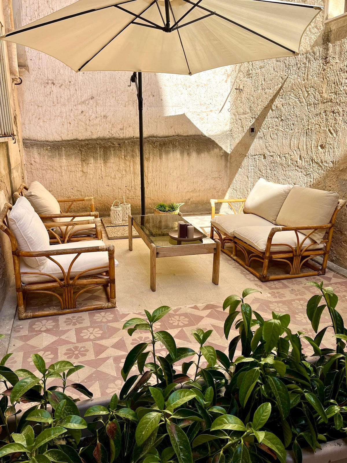 Casa Zagara is a charming 40 m² essential apartment located on the first floor of a traditional limestone tower. It features a double bedroom, living room with kitchen, a small bathroom, and a private rooftop terrace with sea view. Surrounded by lush greenery and shaded by ancient trees, it offers a peaceful and authentic retreat, just steps from the shared garden and outdoor kitchen.