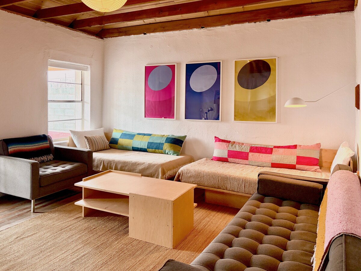 This serene little adobe home has been lovingly restored by its architect owners. High-speed wifi, dedicated work space, and the peaceful quiet created by the sound-dampening adobe walls make this a perfect WFH (away from home) base, while central location and a fully equipped kitchen make the space a perfect spot to relax after exploring the town. Casa Calma is especially close to the majority of restaurants, as well as the best coffee shops and Marfa's unique gem store.
