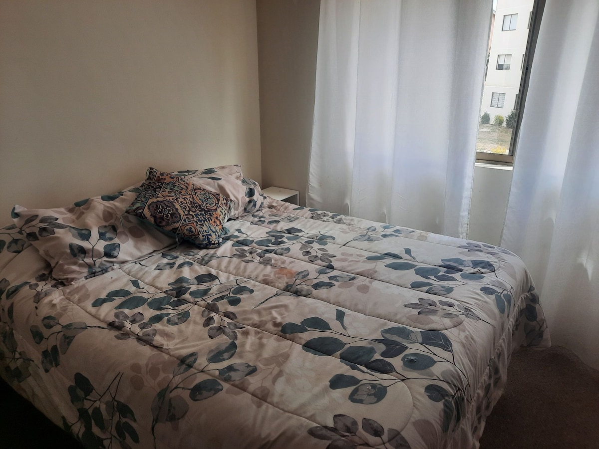 Acogedor espacio con acceso y baño privado ubicado en sector residencial y seguro de Villa Alemana en el límite con Quilpué. La habitación cuenta con una cama de 2 plazas. Entregamos ropa de cama y toallas, la habitación es amplia y soleada y tiene una mesa que puede funcionar como escritorio y un closet. Contamos con hervidor, microondas, frigobar, platos, tazas y servicios. Además, hay un dispensador de agua, té y azúcar para amenizar la llegada de nuestros huéspedes. No recibimos niños.