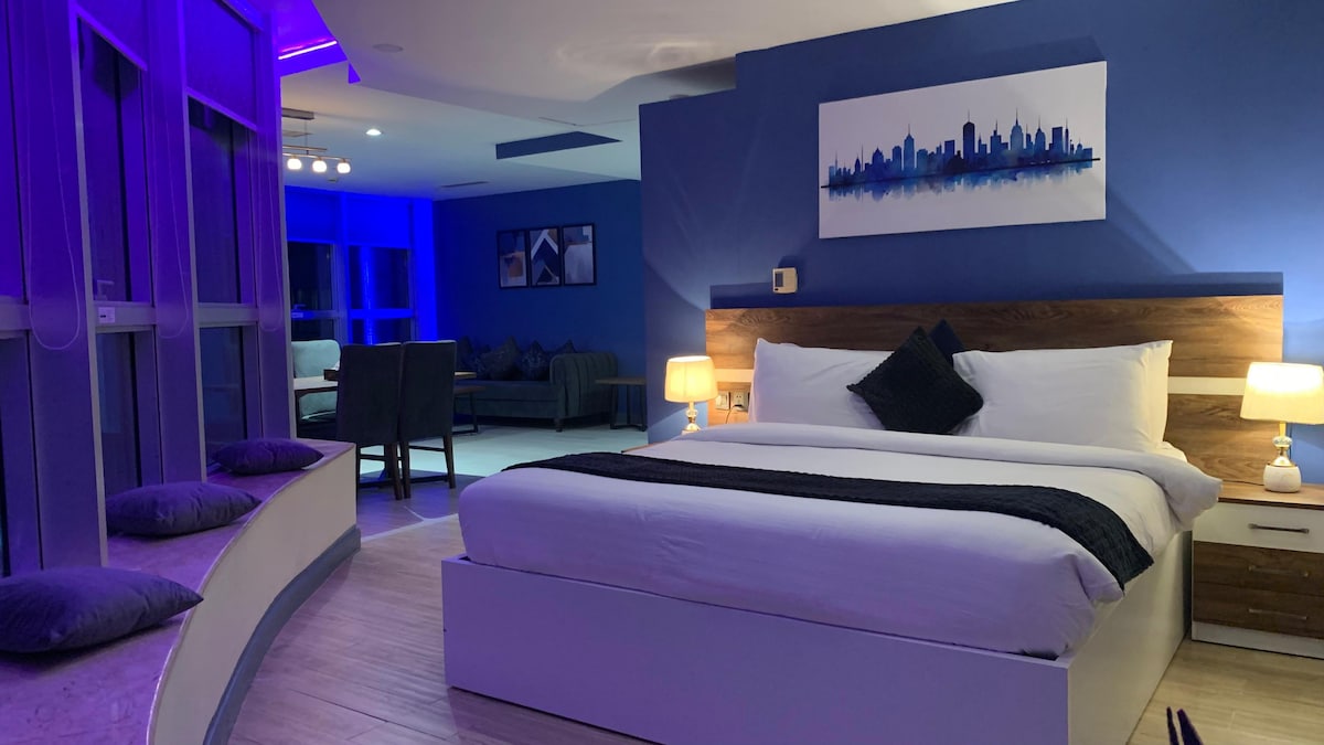 Stay @ Centaurus Mall designed only for classy & refined guests who value quality. Our Modern 1 -bed apartment is the embodiment of modern luxury, large size apartment, spacious bedroom with a spacious lounge, separate kitchen, & dining area. This space is designed to provide you with the utmost comfort & sophistication. Be captivated by Panoramic views of the beautiful city from every corner of the apartment. These apartments offer more than just scenery; they create unforgettable memories