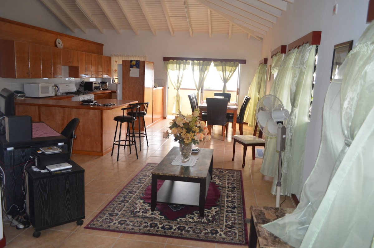 Welcome to your Caribbean bolthole. This is a lovely two bedroom apartment set in the hills of beautiful Montserrat. The apartment is set on the edge of a valley (Ghaut ) with unblocked views of the sea towards Redonda and Nevis and a cool breeze in the evenings. You will have exclusive use of our apartment, with a separate entrance for you to come and go at your leisure. The Host lives in the apartment above, and will therefore be on hand by phone or email if you run into any difficulties.