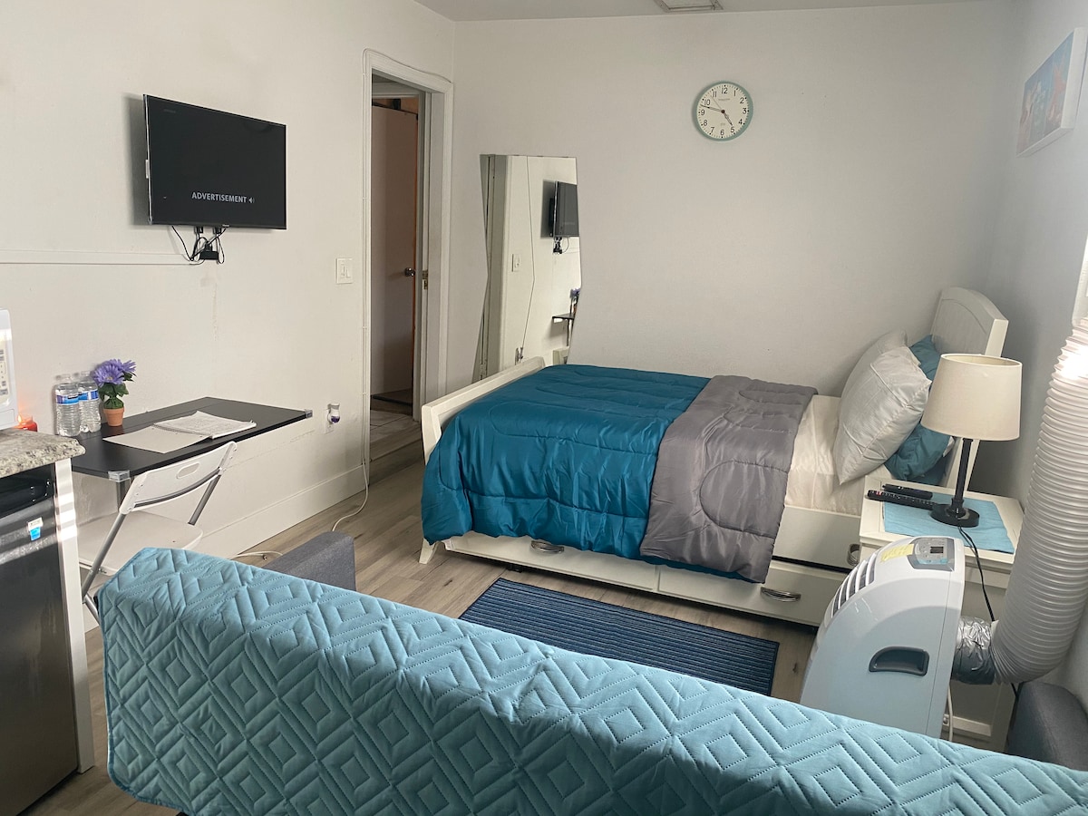 This newly remodeled studio is just a 15 minute drive to and from FLL Airport - ideal for a couple (2 people max). It is a 20 minute drive to the iconic Wave Wall Beach at Las Olas. This studio, (while adjoined to a multi-unit building), offers complete privacy with all access doors to the outside and exclusive access via keypad for you and your travel companions only. Includes: Full Bathroom, Mini Fridge/Microwave, King Bed, TV, Desk & Chair Check-in: 3 PM Check-out: 10 AM