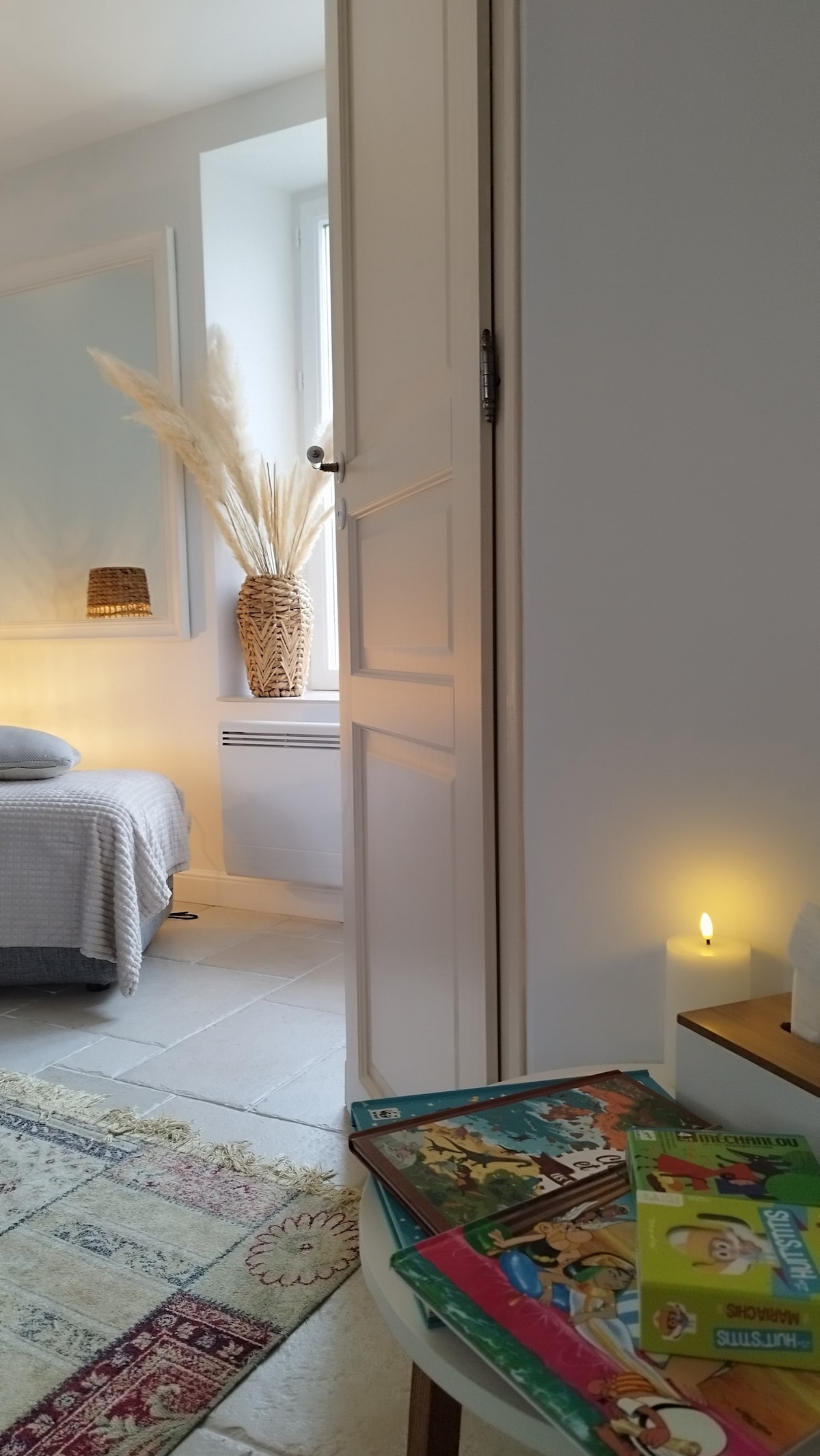 Dans une cour fermée, nous serons ravis de vous accueillir dans notre gîte entièrement rénové. Le logement, très calme et ensoleillé se situe dans une ancienne longère. Il comprend une belle chambre avec TV, un lit de 180 ou 2 lits séparés , sdb, une pièce à vivre avec un salon et son canapé 1 ou 2 places (sur demande)et une cuisine équipée, sel, café .....à disposition. Dans un espace privé avec salon de jardin, nous pouvons accueillir vos animaux de compagnie en le précisant à la réservation