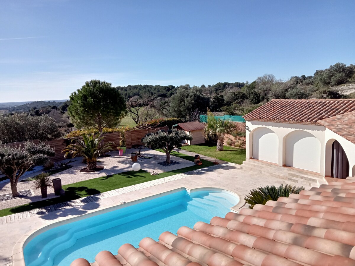 Meublé de tourisme classé 4 étoiles. Villa contemporaine neuve spacieuse (La pierre des garrigues 1) de quatre chambres dans la garrigue nîmoise, accessible aux personnes à mobilité réduite. Piscine privative de 8m*4,50m sous abri, sécurisée, chauffée en mi-saison. Deux salles de bain et deux WC, une belle pièce de vie avec cuisine équipée. Climatisation réglable dans chaque chambre. Borne voitures électriques. Plancha et barbecue au gaz. Terrain clos de 1800 m². Proche Uzès. 8 personnes max.