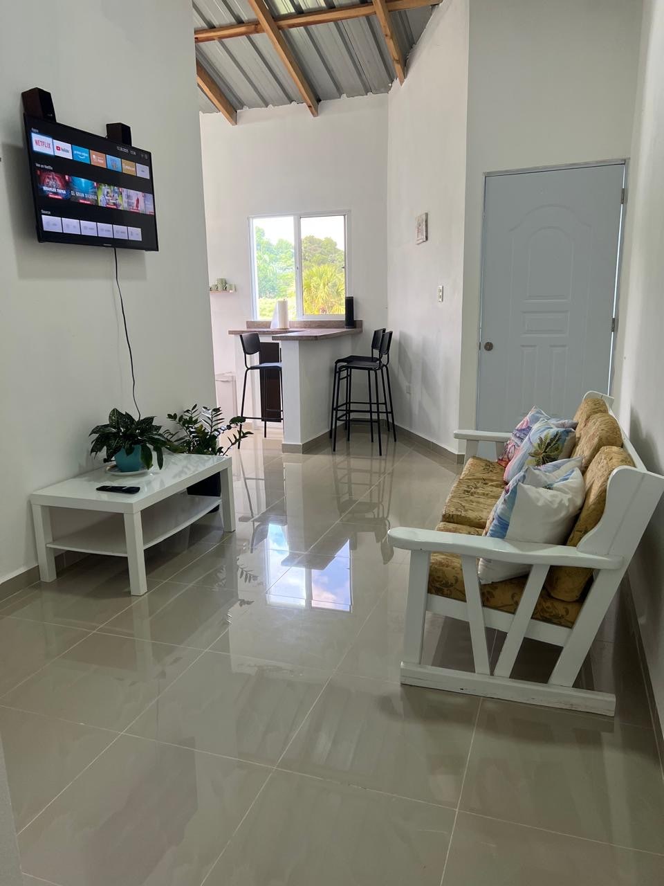 Lindo apartamento ubicado en la parte alta de la ciudad, con dos cómodas habitaciones cada una con su aire acondicionado y 2 lámpara de abanico de techó, 1 baño moderno con agua caliente, cocina con todo sus accesorios, tv de 40 pulgada, YouTube Premium y Netflix, un ambiente tranquilo y seguro para que te sientas como en tu casa.