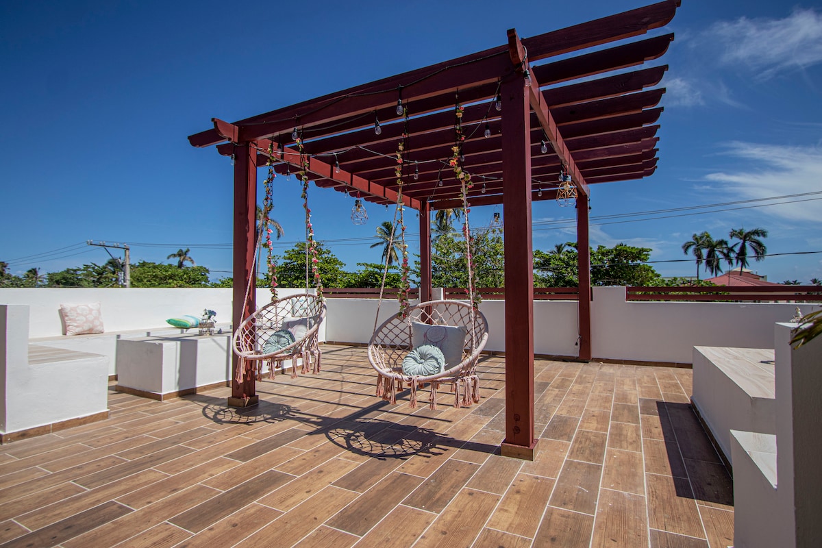 En una ubicación inmejorable en el centro del pueblo! A solo 10 minutos caminando del Malecón! A tan solo 2 minutos caminando de: - Parque Central - Supermercado - Tiendas - Restaurantes - Farmacia y cualquier cosa que puedas necesitar. Gran terraza compartida con hermosas vistas y BBQ. Apartamento nuevo con diseño exclusivo para 4 personas. Nuestro alojamiento está a unos 10 minutos manejando a la playas locales y a unos 20 minutos a las playa de Río San Juan ..