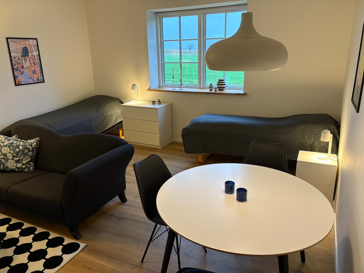 Slap af i denne unikke og rolige bolig. Her er plads til et kortere eller længere ophold midt i naturen. Lejligheden er holdt i en smuk nordisk stil med en hjemlig indretning. Lysets indfald og den grønne natur med marker og træer omkring skaber en særlig stemning, som giver lyst til bare at være.
