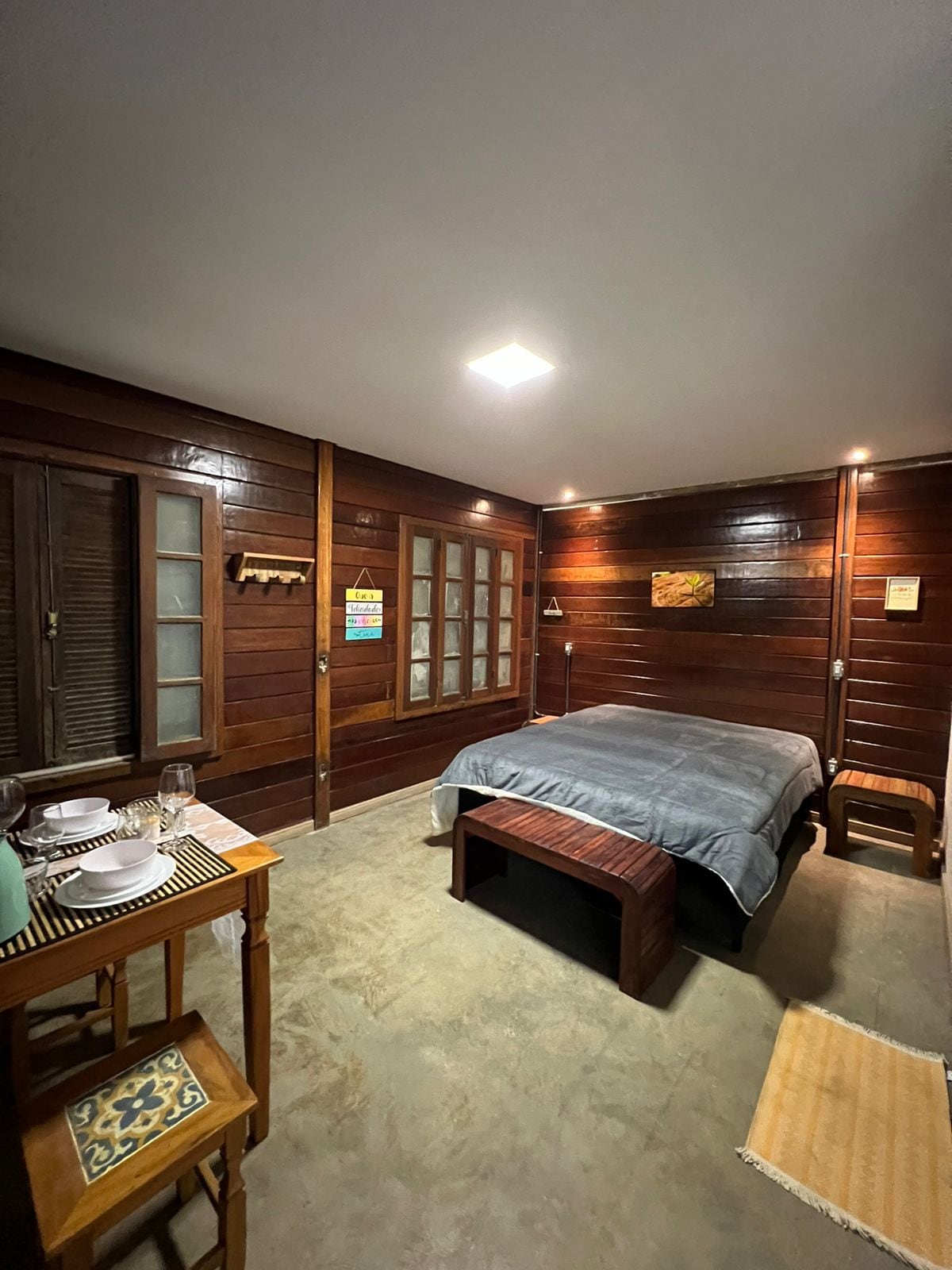 Aproveite essa acomodação moderna, construída em estruturas de madeira de demolição, prestigiando materiais rústicos e locais, como a pedra sabão nas pias das suítes, bancadas e cabeceiras de cama em pranchas brutas de madeira. Forros e armário de cozinha em taquara. Móveis e detalhes de decoração aconchegantes.