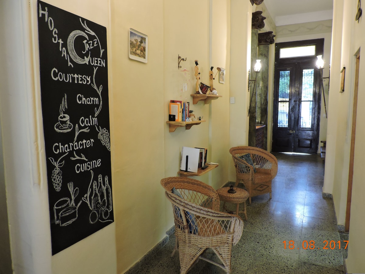 Hostal Jazz Queen, ubicado en un barrio residencial de la Habana, a 25 minutos aproximadamente del centro de la Habana y cerca de varias conexiones de guagua a diferentes puntos de la ciudad y tenemos servicio de auto con un costo adicional. Nuestras habitaciones son privadas con baños personales y poseen el confort y relax necesario para tus vacaciones. Nuestra casa se encuentra en Avenida Santa Catalina 354, entre Cortina y Figueroa , Santos Suárez , Municipio 10 de Octubre,La Habana, Cuba.