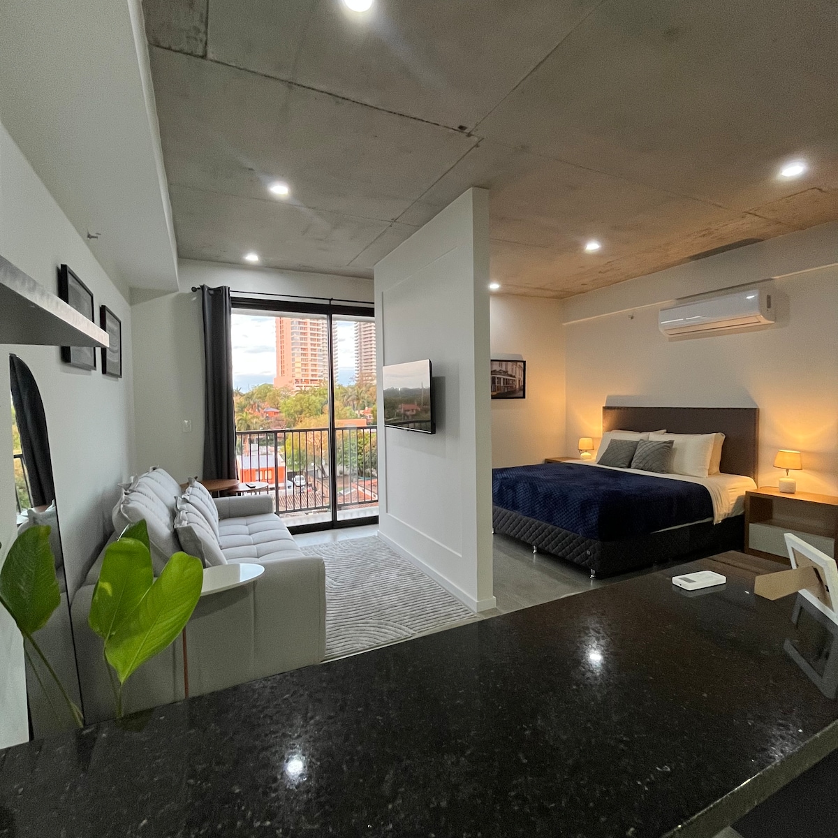 Departamento nuevo a estrenar en edificio lujoso. Tiene 40m² propios, con Smart TV, WIFI, y en el edificio tenes todos los amenities: Piscina , Quincho climatizado con parrilla, Sala de juego de niños, gimnasio equipado, etc Queda a 5 minutos en auto del centro corporativo mas valorado de la capital, y a 25 minutos caminando. Tambien queda a 11 minutos en auto al aeropuerto Silvio Pettirossi Tiene una cama matrimonial + un sofa cama. En total se pueden hasta 3 personas para dormir.