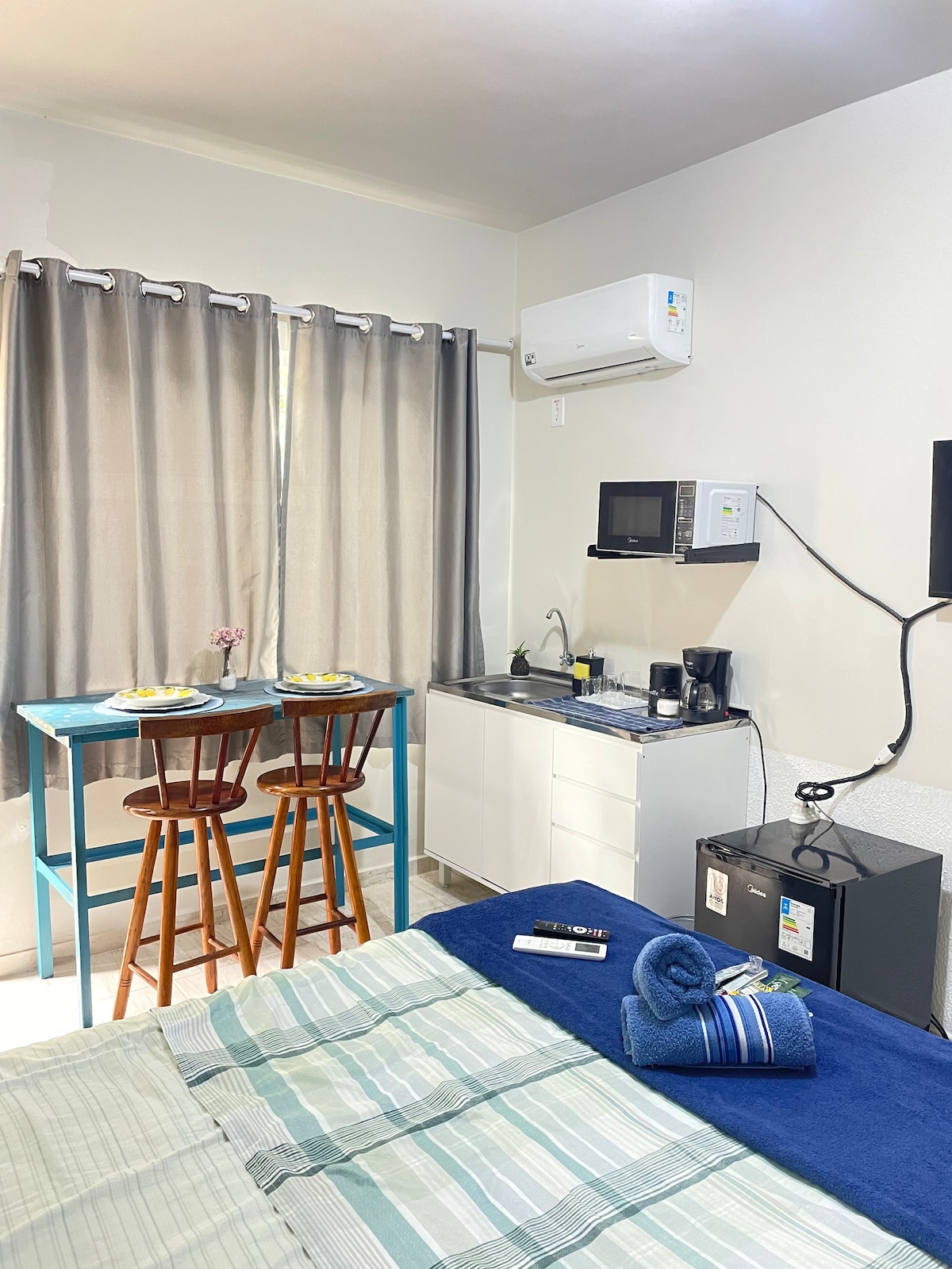Sobre o imóvel: - Studio com 25m² e fica localizado a 5 minutos de carro da praia e a 2 min do Centro Comercial (BARROCO); - Garagem privativa; - Acomoda confortavelmente até 3 pessoas; - Varanda espaçosa . Destaques: - Cozinha equipada com cooktop por indução duas bocas, forno elétrico, microondas, air fryer, sanduicheira, cafeteira dolce gusto, cafeteira elétrica e liquidificador. - Wi-fi de alta velocidade; - Ar condicionado; - Ventilador de teto; - Smart TV.