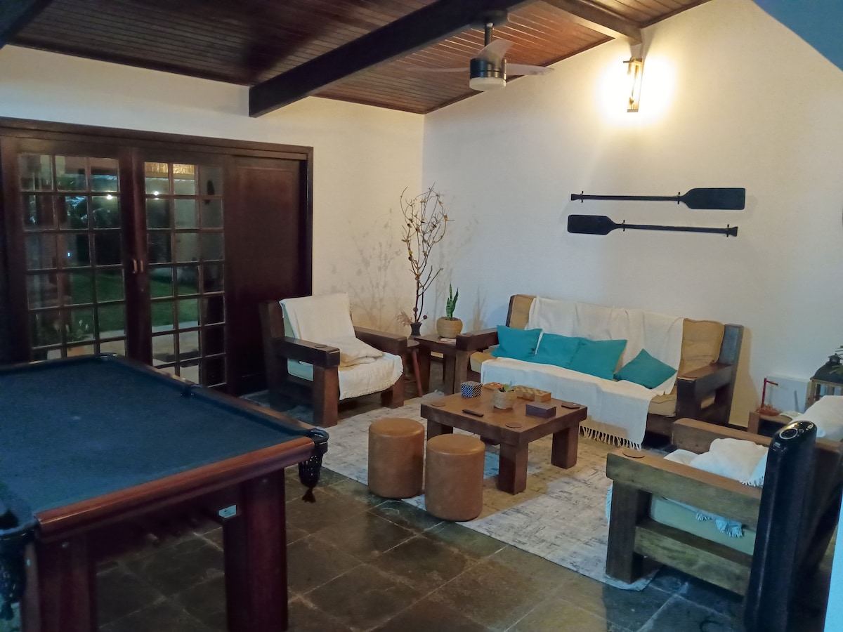 Relaxe em nossa ampla piscina cristalina e celebre momentos na área gourmet completa, o ponto alto da casa! Um espaço de 1000m² com decoração sofisticada, cercado de natureza e com vista para a montanha. Tenha dias de lazer e paz, com total privacidade e fácil acesso ao centro (6 min) e à praia (7 min). O refúgio perfeito espera por você.
