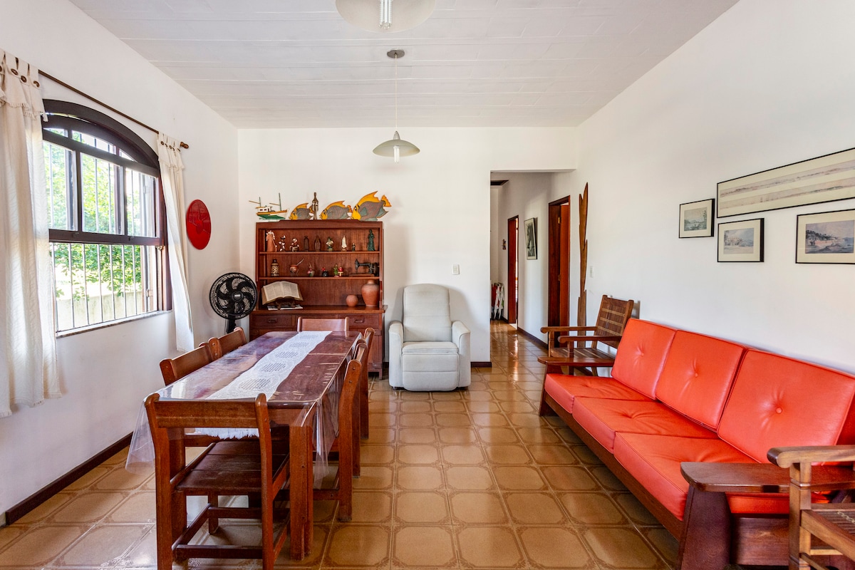 Casa com piscina, churrasqueira, sinuca, totó, ping-pong, Wi-fi e vista para Lagoa de Jacaroá, a 5 minutos do centro de Maricá (acesso asfaltado). Localizada em um platô,a casa possui 2 andares. O andar superior(principal) possui 4 quartos sendo 1 suíte e 1 dependência, 2 banheiros, sala ampla com varanda e cozinha equipada. O andar inferior possui um quarto, cozinha, banheiro e um grande salão de jogos com varanda.