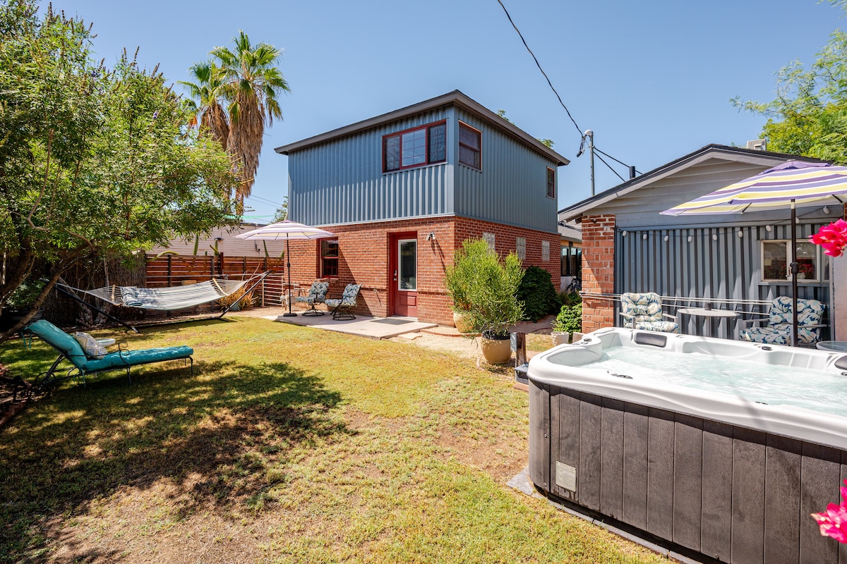 Welcome to your private casita (tiny home) in the heart of Midtown. Located right across the street from Starbucks, Buffalo Exchange, and the famous Taco Guild, relax comfortably with vaulted ceilings, a spacious layout, outdoor patio, and a quiet bedroom with a Queen-size bed — perfect for solo travelers or couples. Plus, the Light Rail station is walkable, which goes to Uptown, Downtown, the airport, Tempe, and Mesa. You are only: 7 mins to Downtown 9 mins to the Airport 15 mins to Scottsdale